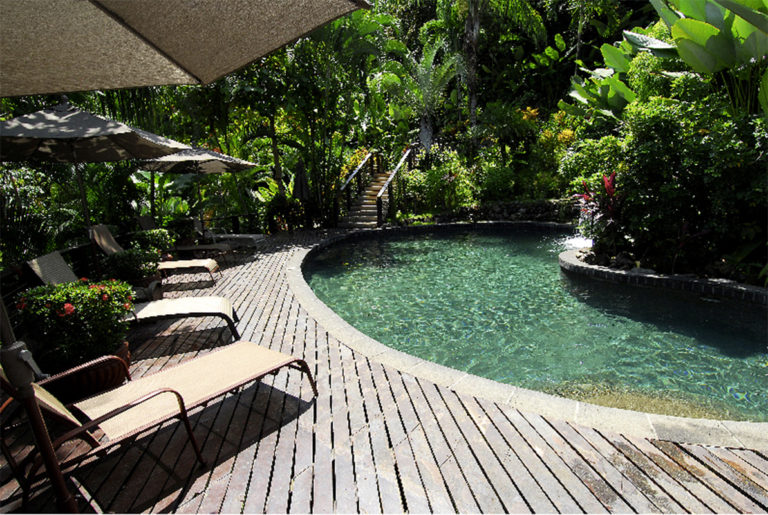 This premium bungalow is a 2 story, 2 bedroom retreat nestled into the jungle hillside in the No.1 Resort in the World – Rated by Trip Advisor 2018. On the entrance level (upper level), your common living area, open style kitchen with stainless steel appliances, 1/2 bath and an gorgeous balcony with a dining area and romantic jacuzzi. The lower level features 2 suites with private full baths each with 2 queen beds and 1 suite with 1 king size bed, sleeps groups of 6 comfortably with an extra Full size daybed in living area to accommodate groups up to 8.  Each full bath has an open air showers with a Bali tropical design to give you the complete rainforest sensation & experience. Both Bedrooms share a wrap around balcony that’s perfect to relax in the morning with a fresh cup of coffee while watching the wildlife play in the jungle canopy around you.